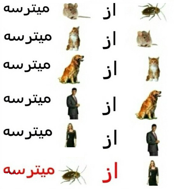 زن: حالم خیلی گرفته حس میکنم الان این پلنگ آهوی بیچاره رو میگیره و میخوره. مرد: عزیزم این قانون طبیعته پلنگ اگه گشنه باشد باید آهو رو بخوره. زن: یه کاری بکن که اونو نخوره، مرد: تو حالت خوبه، من چکار میتونم بکنم. زن: خوب گوش کن اگه پلنگ آهو رو بخوره به مادرم میگم یه ماه بیاد پیش ما زندگی کنه...
